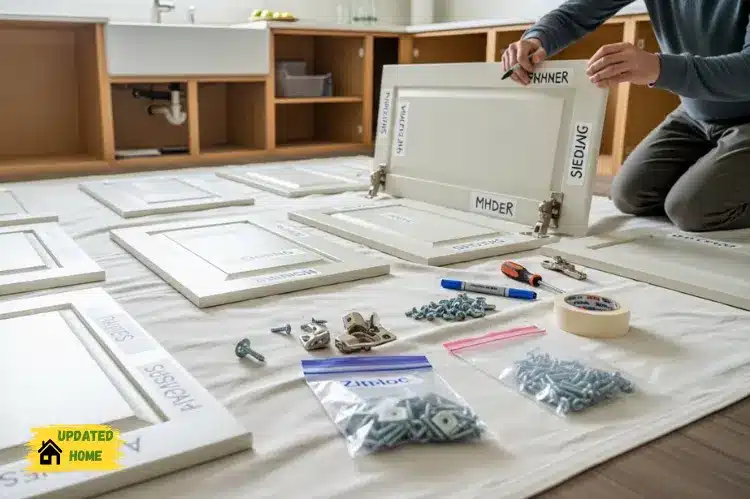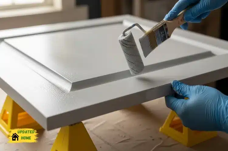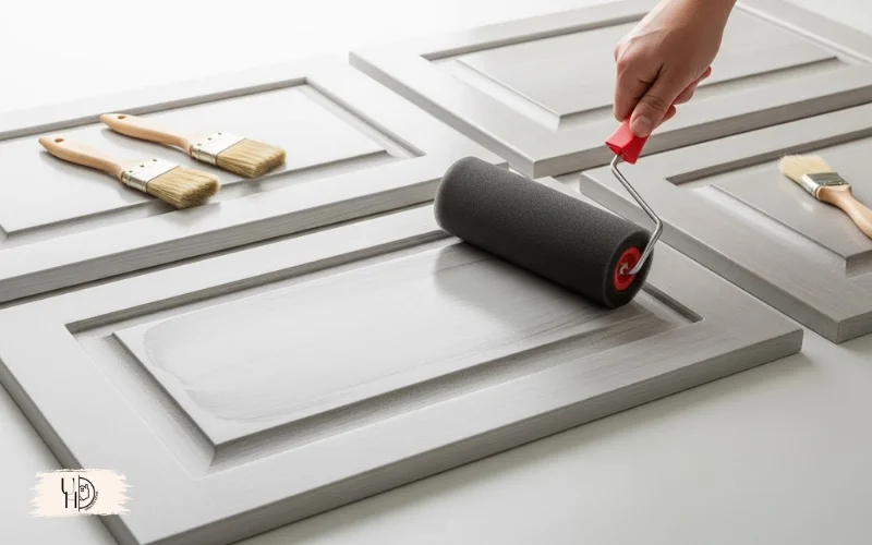 Start with the backs of doors first (if painting both sides). Once dry, flip and paint the fronts. For cabinet frames, work top to bottom. Use a foam roller for flat panels and brush the edges and recessed areas.