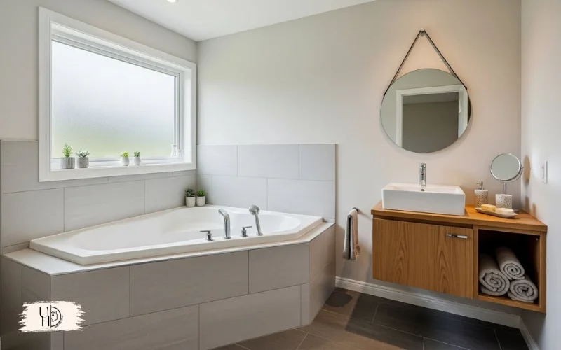 Each shelf holds toiletries, towels, or decorative items without protruding into the room. It’s ideal for small master bathroom ideas with tub where space is premium.