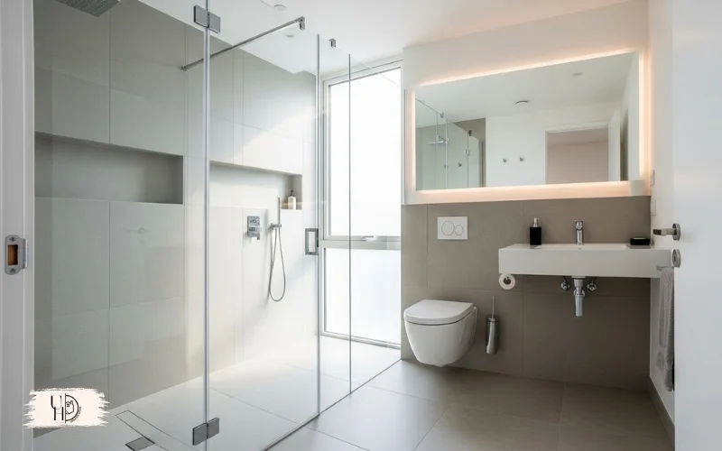 This modern master bath idea works especially well in small modern master bathroom ideas. The transparency maintains visual flow throughout the space.
