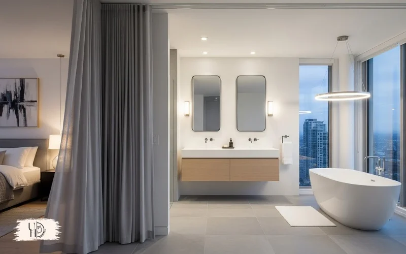 Here’s my secret: I removed the bathroom door entirely and hung a curtain on a ceiling track. This open master bathroom concept saved space and looks unexpectedly chic.