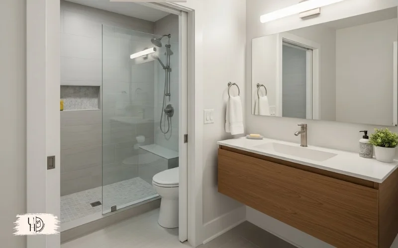 This solution transformed my cramped small master bathroom plans into a functional space. It’s perfect for master bathroom layouts where traditional doors block fixtures.