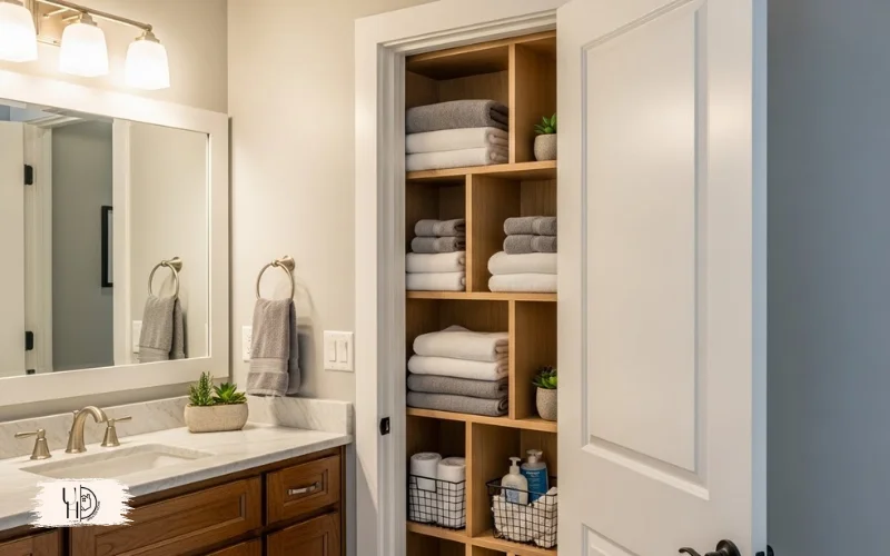 This small bathroom idea modern solution adds storage without taking any room space. Perfect for master bathroom ideas without tub where you need towel storage.