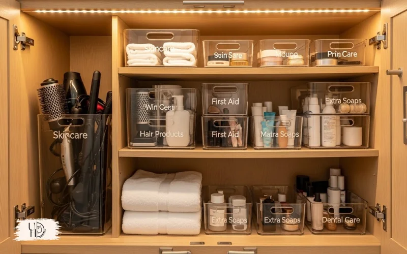 This organization method works in any small master bath floor plans. Label each bin to maintain order in your master bath remodel.