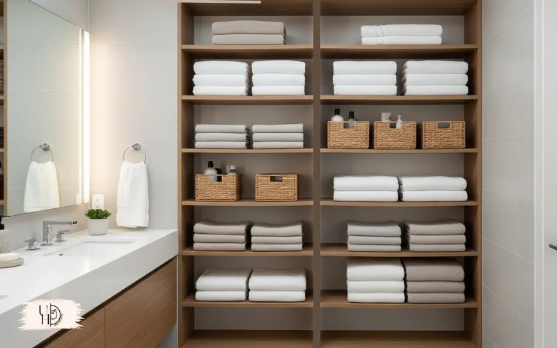 I use the top shelves for seasonal items and keep daily essentials at eye level. It’s one of those bathroom designs for small spaces that actually improves functionality.