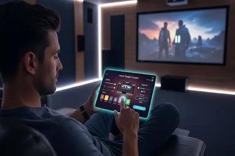 A homeowner controlling a full home theater setup using a smart tablet interface.