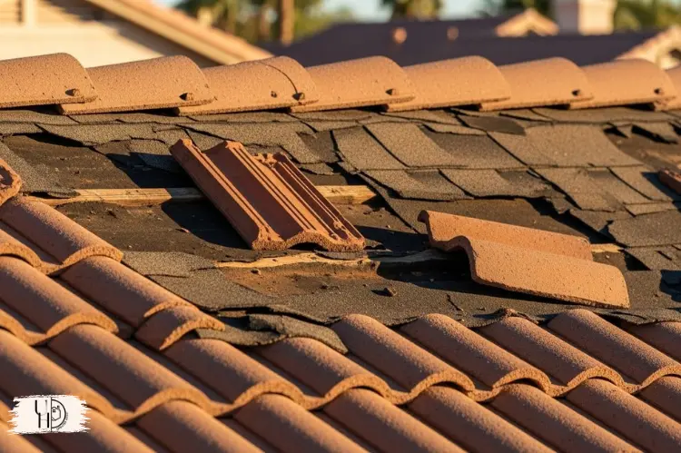 Close-up of cracked roof tiles and missing shingles on a Scottsdale home roof.