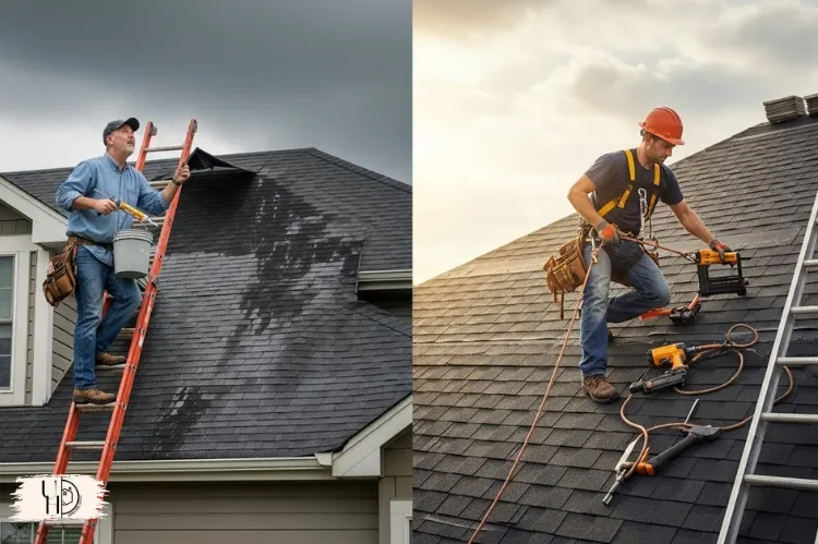 Split image showing homeowner try a repairing roof leak and other, a professional roofer performing repairs safely on the roof.