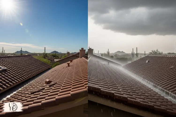 A split-scene image showing a Scottsdale roof under intense desert sun on one side and heavy monsoon rain and wind on the other.