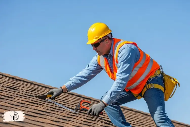 Licensed roofing contractor in Scottsdale conducting a roof inspection with safety gear and tools.